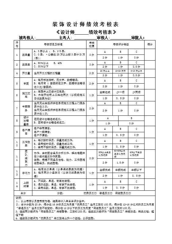 装饰设计师绩效考核表