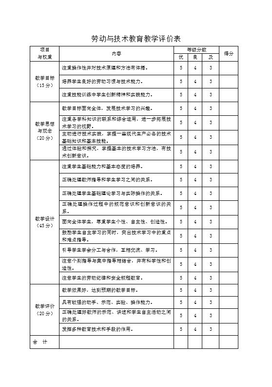 劳动与技术教育教学评价表
