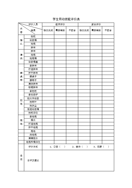学生劳动技能评价表